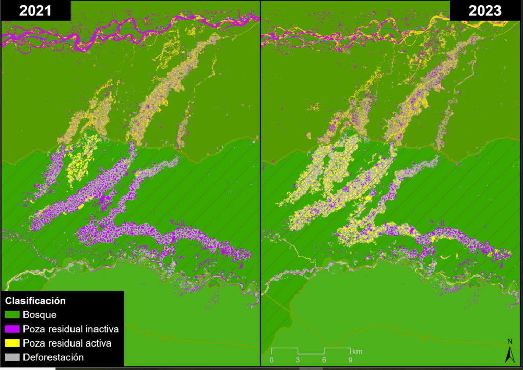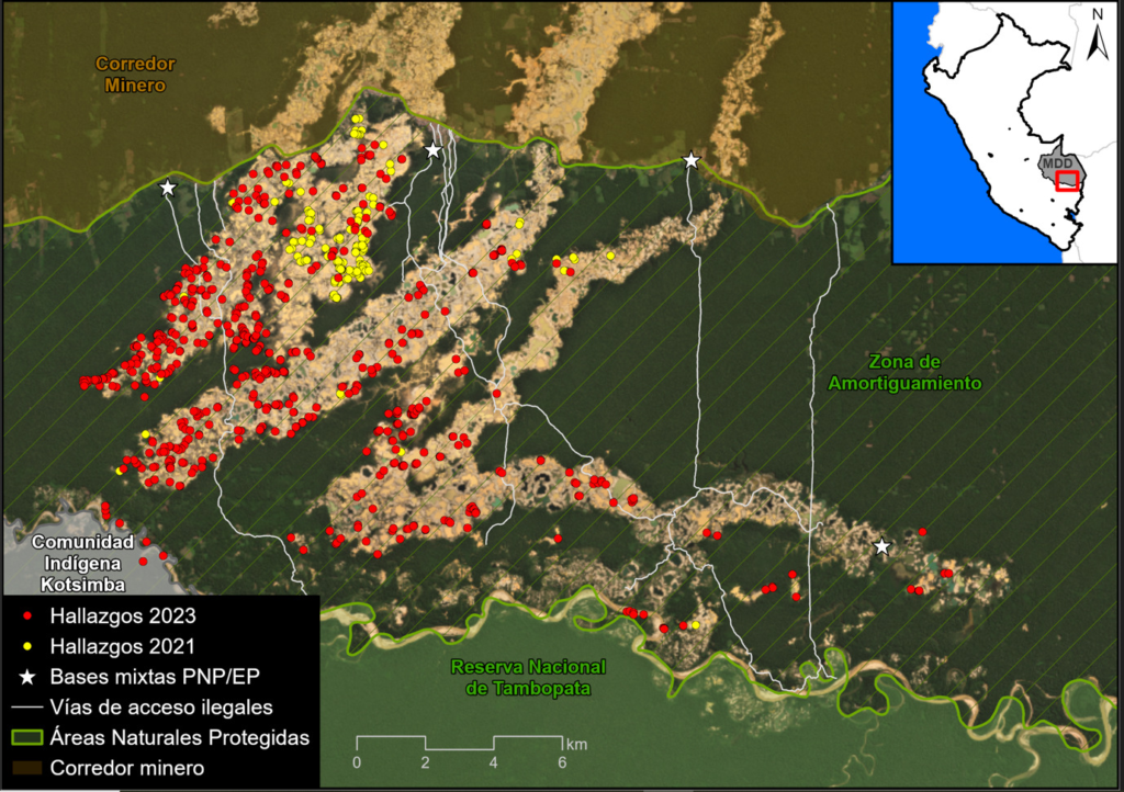 Sin embargo, un análisis más detallado que utiliza imágenes de muy alta resolución (0.5 metros) muestra un significativo incremento de infraestructuras mineras y la actividad minera en áreas previamente deforestadas por la minería ilegal, las cuales habían sido recuperadas por el gobierno peruano tras la Operación Mercurio.
