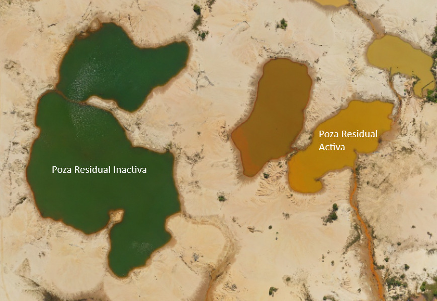 Uno de los impactos que deja la minería ilegal, además de áreas deforestadas, es la generación de pozas residuales donde se concentran sedimentos removidos del suelo y elementos contaminantes utilizados durante la extracción del oro (Ej: mercurio). Estas pozas residuales tienen coloraciones características que están asociadas a la presencia de la actividad minera. Es así que, pozas activas con constante remoción de sedimentos presentará una coloración crema, similar a la de las áreas deforestadas, mientras que una poza inactiva o que ha sido abandonada presentará tonalidades verdes azuladas, producto del inicio de la actividad fotosintética de algas colonizadoras (Ver Figura 4).